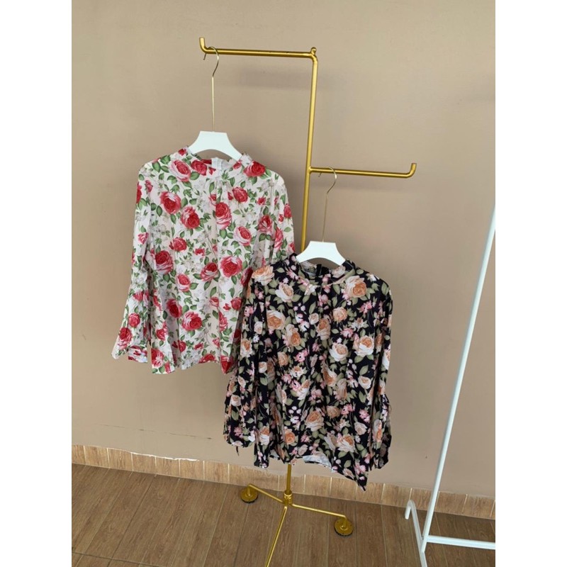 Name: Blouse 8547 Leher Sanghai Atasan Blouse Wanita Tangan Puff Lengan Panjang Balon Bunga Flower Import